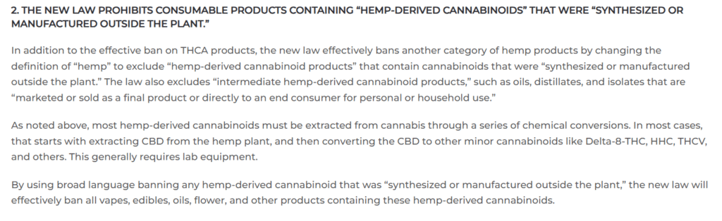 On November 12, 2025, President Trump signed legislation to end the government shutdown that includes a federal ban on most hemp products that contain THC and other hemp-derived “cannabinoids.” The new law goes into effect a year from now.