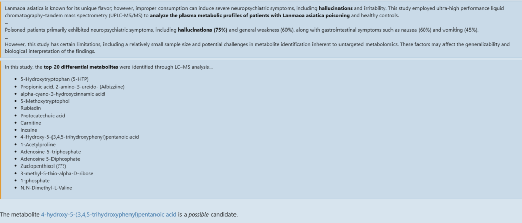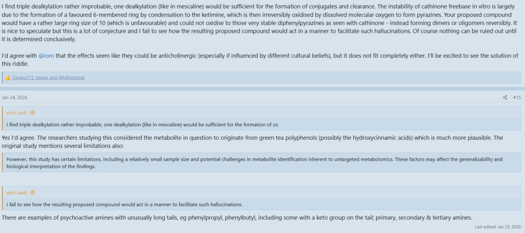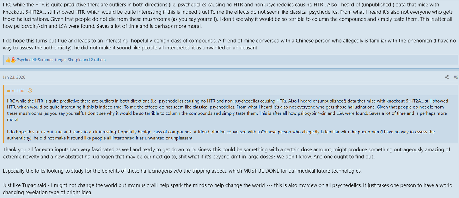 While what makes the mushroom hallucinatory is still unknown to science, this quote actually brings us more clues to what makes the mushroom cause hallucinations than we might think, and so users on the notorious psychonaut forum Bluelight caught up to this little detail and began speculating about what could be the compound responsible for such lilliputian hallucinations using the data and the chemical composition of the mushroom we currently have available.