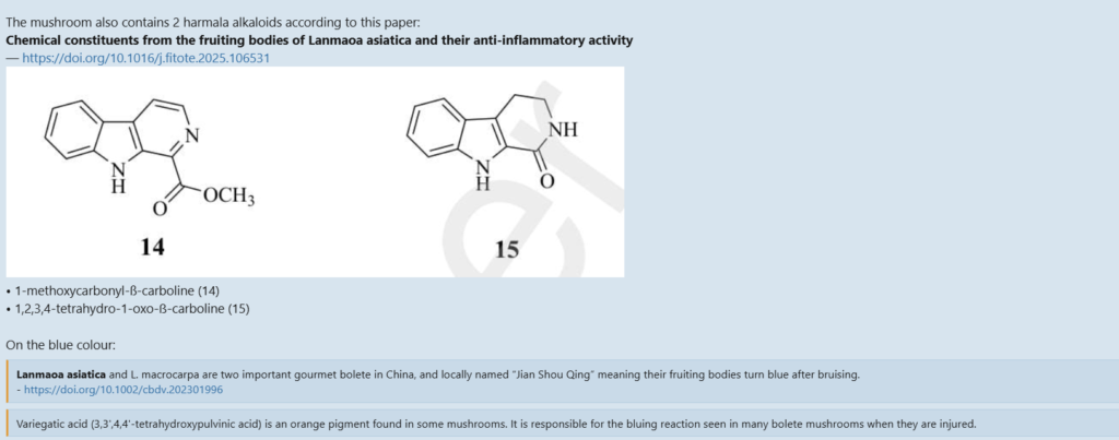 The reason why lies in the cultural and folk knowledge surrounding the mushroom and its hallucinatory effects, while the species is fairly recently acknowledged by science, Lanmaoa Asiatica, like Ayahuasca, once had deep ancient roots in the Chinese culture, with data remoting to Daoist texts from the 3rd century CE refering to a flesh spirit mushroom that if consumed raw allows people to “see a little person” and “attain transcendence immideatly”.