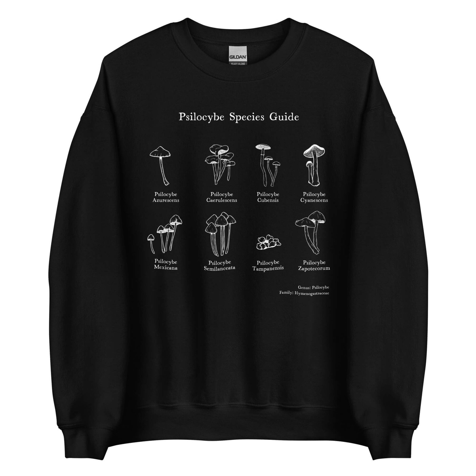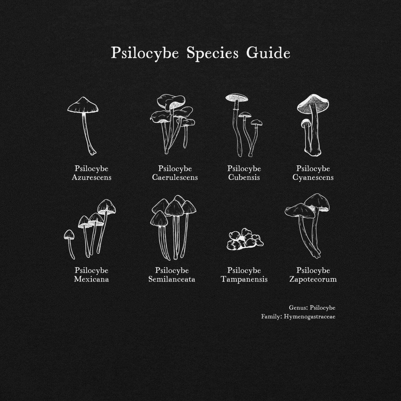 Foraging for mushrooms is a hobby of many people in the psychedelic community, especially when it comes to hunting down the Psilocybe species. This shirt is not just an ode to the most well-known species within the Psilocybe genus, but a wearable field guide to remind us of the shape and details of the fungi we love. If you are a mushroom foraging lover or love learning about mycology, this wearable is made for you.