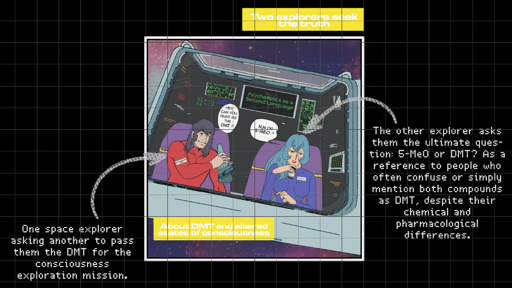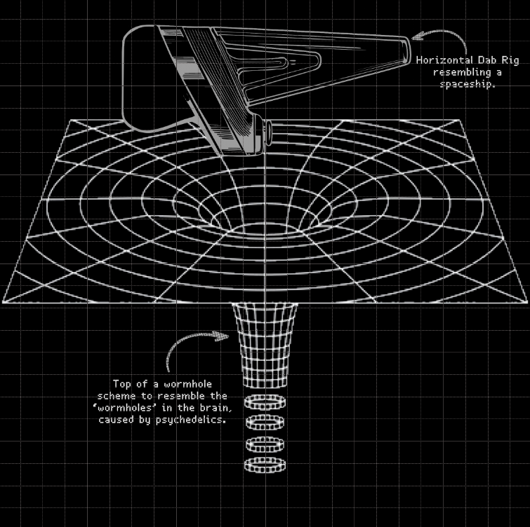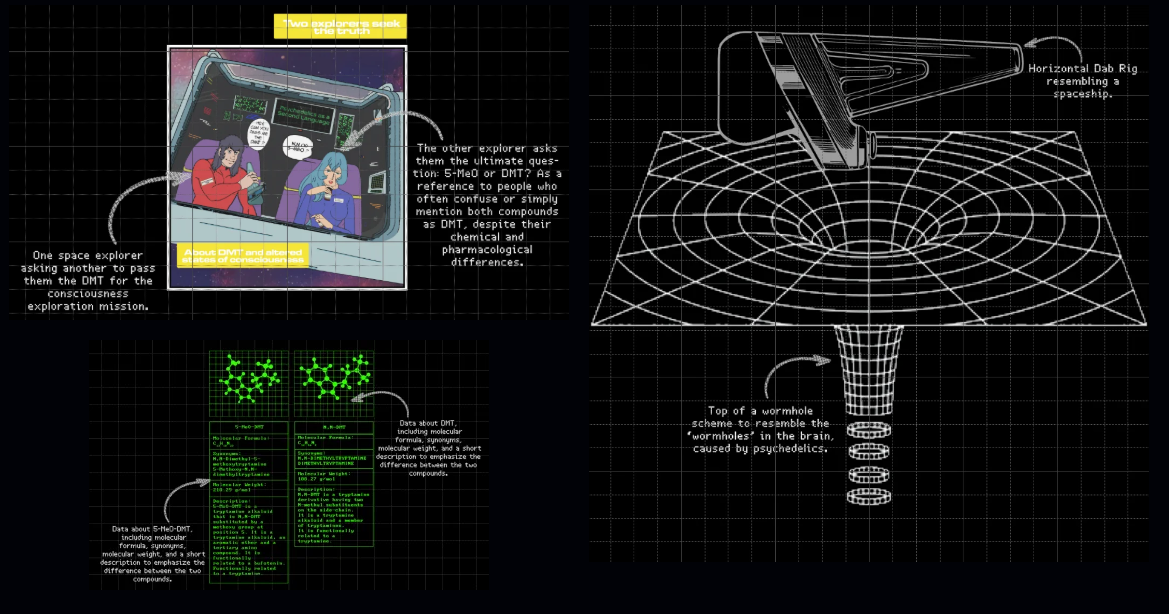 As a way to feature all of those elements, we’ve decided to set the scene in the space, featuring the wormholes previously mentioned, and what seemed to be the most popular paraphernalia in Reddit and Discord users when it comes to DMT, dab rigs, which would serve as a spaceship for two characters inspired by retro sci-fi cartoons.
