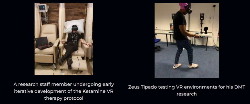 Currently, we know of at least two forms of VR-Psychedelic therapy being studied, Ketamine Infusion Therapy, aided by VR (check the podcast of one of our friends, Dr. Melissa Selinger, on the subject, or read the first publication of her and the team on this research). Another notable study using VR is from one of our friends, Zeus Tipado, and the Psychopharmacology department at Maastricht University, with the aim of combining DMT with VR. While both compounds are very different from a user perspective, I firmly believe Ketamine would be a more suitable compound for this type of research. Given that DMT can become too overwhelming for patients due to its strong visual-hallucination effects. For this reason, there are some compounds that we might see entering this field of research in the future and become somewhat promising in managing how an experience might go by providing the right visuals.